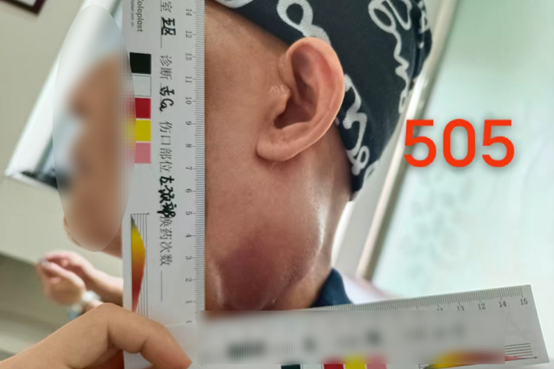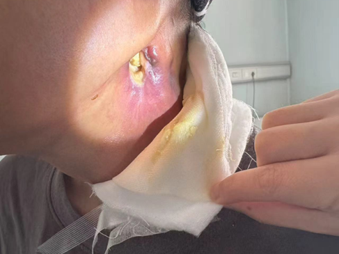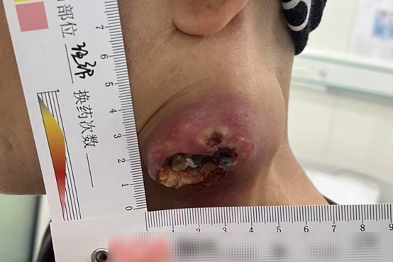 At admission, Ms. Zhou had enlarged lymph nodes on both sides of her neck. The one on the left was particularly prominent—about 5 cm in size—with ulceration on the surface and yellow fluid discharge. She looked extremely frail.